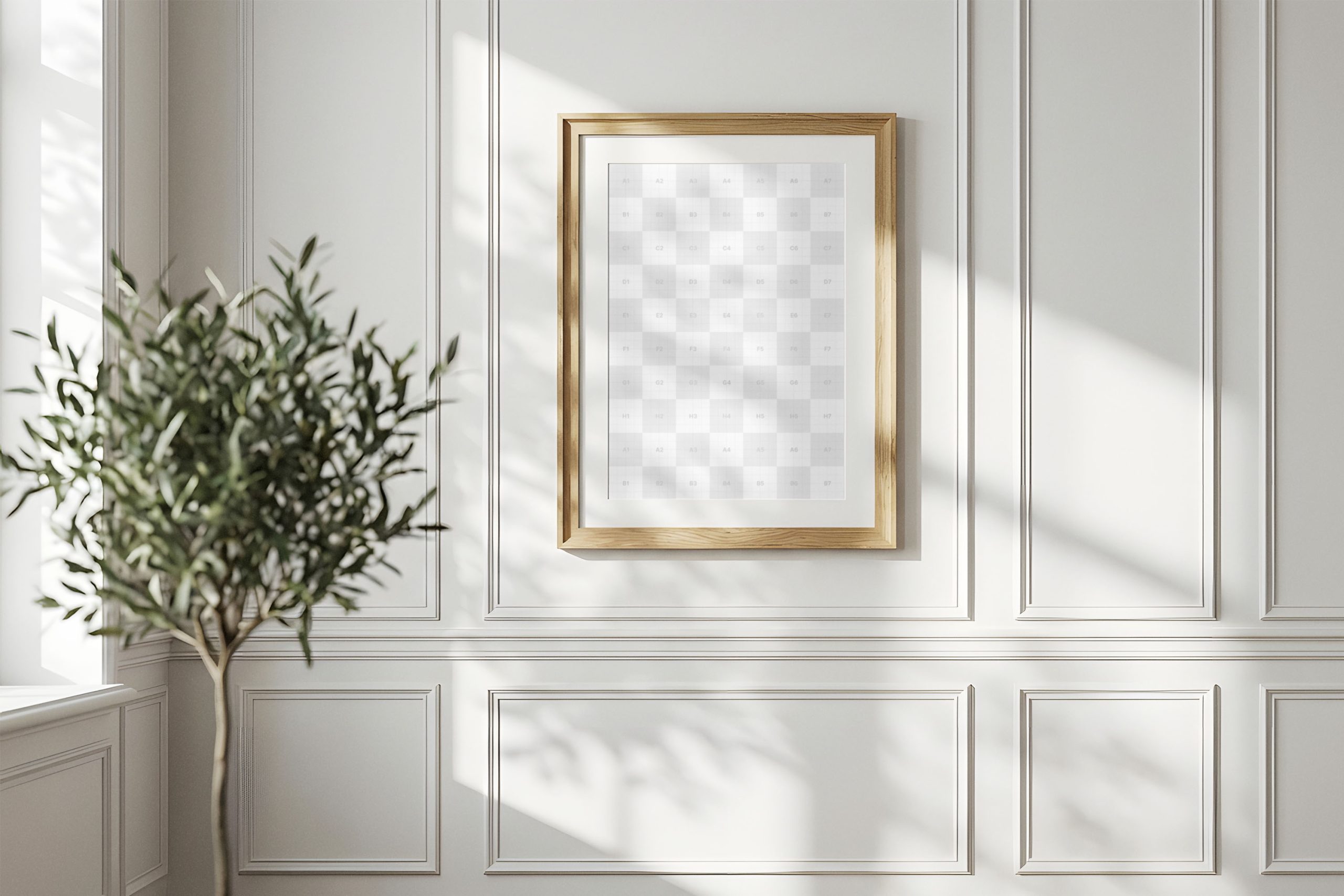 This professional Wooden Poster Frame Mockup offers a sophisticated way to present your vertical artwork, posters, or photography within a refined interior setting. Set against a classic white paneled wall with soft, natural sunlight and organic leaf shadows, this scene provides a high-end atmosphere that enhances any design. It is an essential asset for graphic designers, illustrators, and branding specialists looking to create a realistic portfolio or client presentation. The meticulous attention to detail in the textures and lighting ensures your work looks authentic and polished. Use this mockup to visualize how your prints would appear in a modern home or gallery environment. With its clean aesthetic and neutral color palette, it seamlessly integrates with various artistic styles, making it a versatile addition to your creative toolkit. Elevate your visual storytelling and impress your audience with this high-resolution, lifelike interior display.