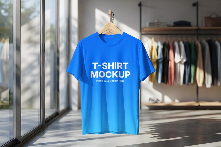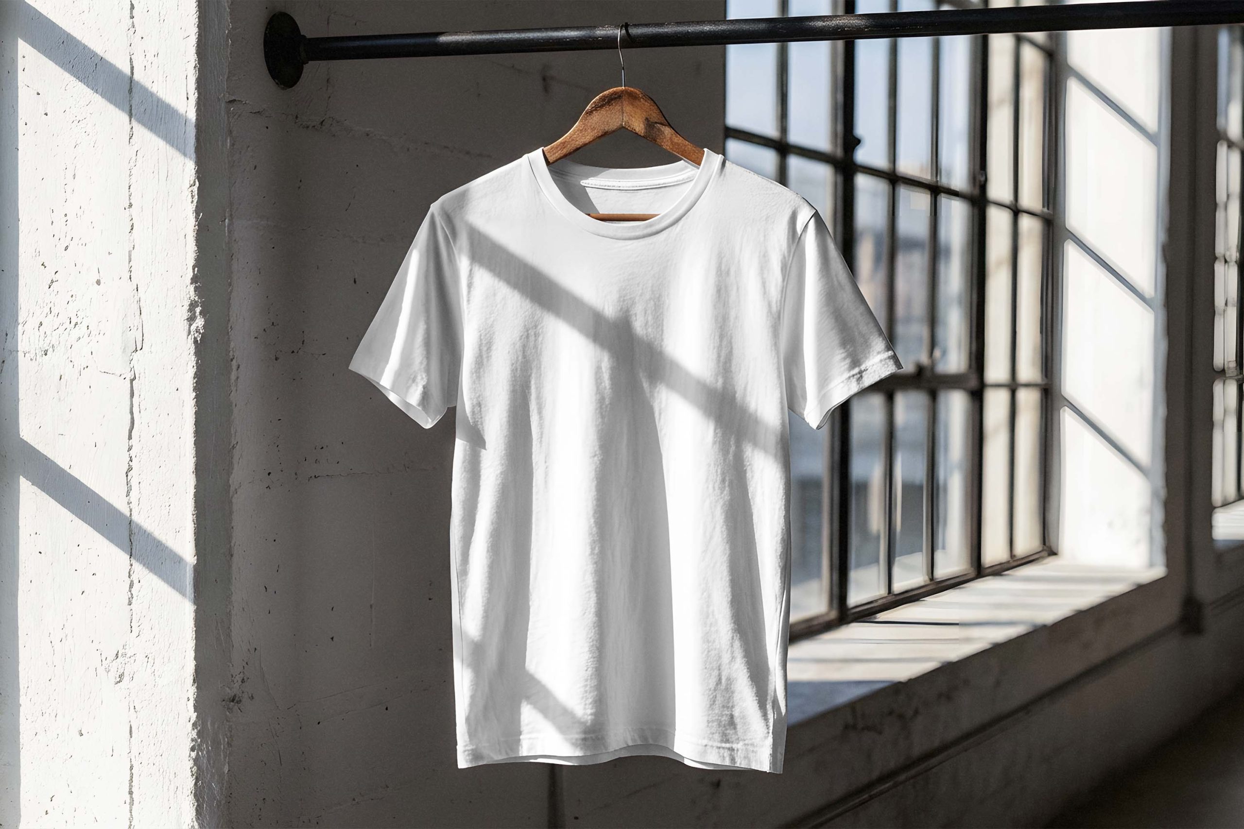 Elevate your apparel branding projects with this realistic free t-shirt mockup. This high-resolution template features a classic crew neck t-shirt hanging on a wooden hanger against a minimalist industrial brick wall. The natural window lighting creates soft shadows and authentic textures, perfect for showcasing your logo designs, typography, or illustrations in a lifestyle environment. Designers and clothing brand owners can easily place their artwork onto the fabric for a professional presentation that resonates with clients. This versatile asset ensures your creative vision stands out with incredible detail. Get this free mockup today.