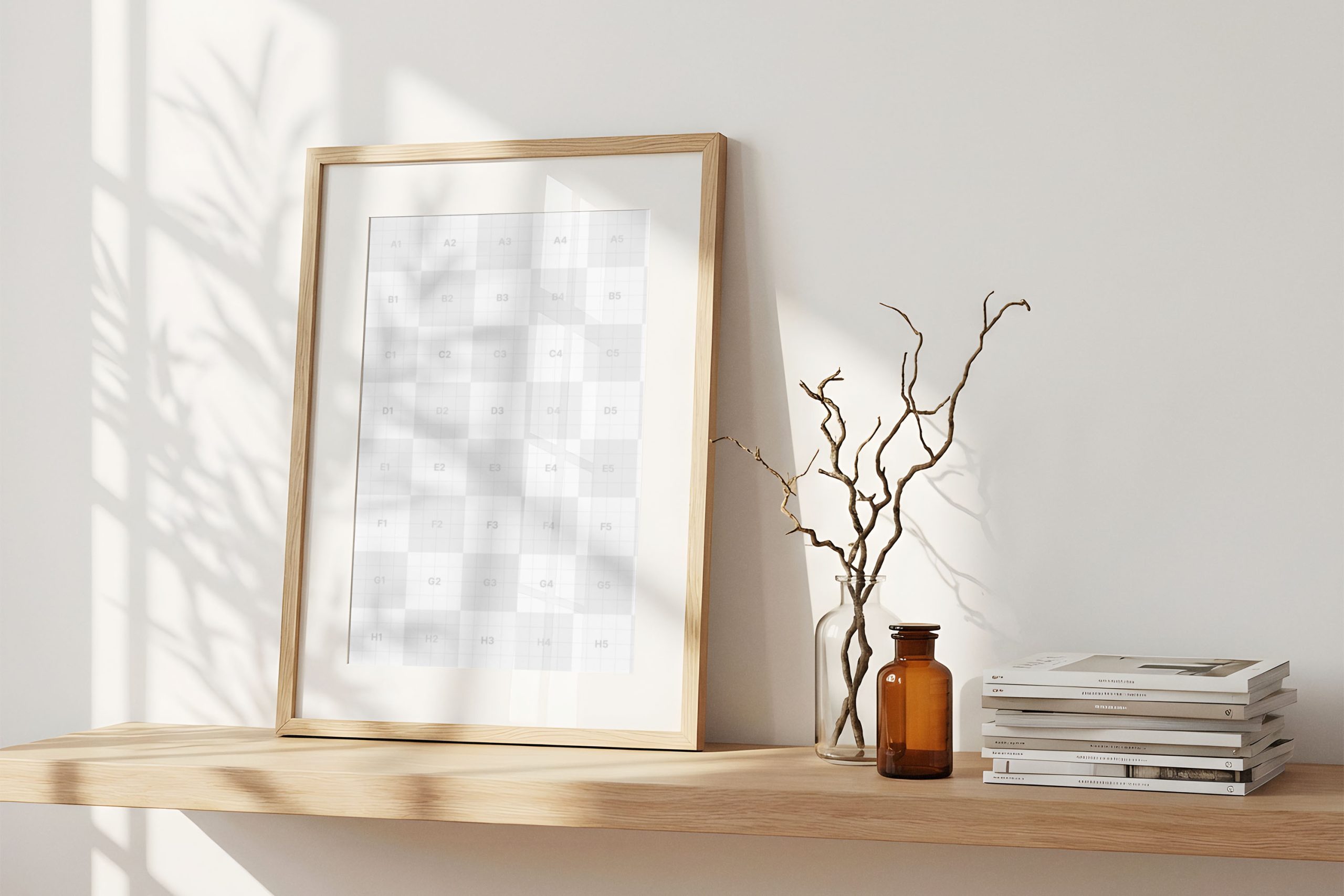 This minimalist wood poster frame mockup offers a sophisticated way to showcase your art prints, photography, or branding projects. Featuring a natural light aesthetic with delicate leaf shadows, this high-quality file provides a realistic interior setting for any creative professional. The vertical frame sits elegantly on a light wood shelf, accompanied by curated decor elements like dried branches in glass bottles and a stack of magazines. This mockup is perfect for artists and designers looking to present their work in a clean, modern lifestyle context. Whether you are building an online portfolio or preparing a client presentation, the high-resolution scene makes it effortless to display your designs with a professional finish. The neutral color palette ensures your artwork remains the focal point while maintaining a cohesive, high-end look for your marketing materials and social media posts.
