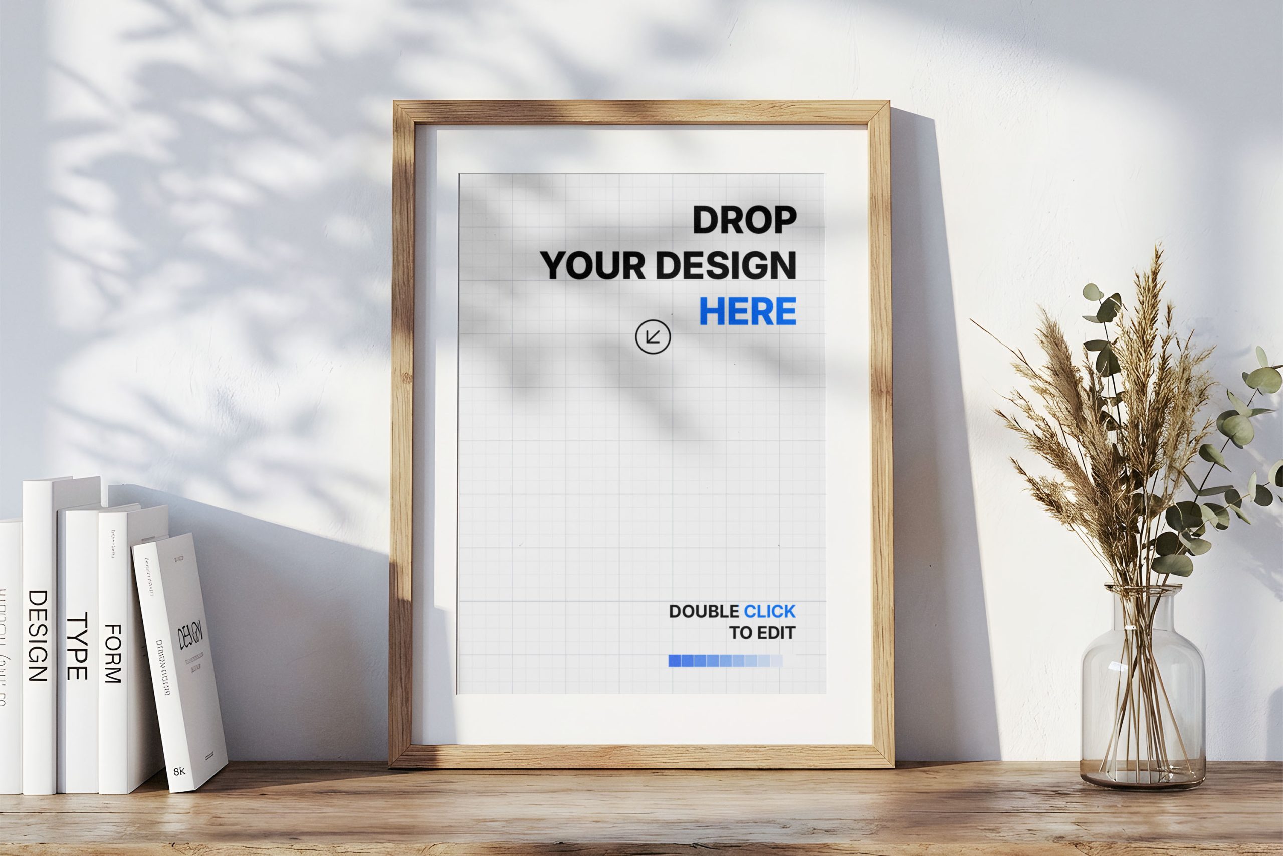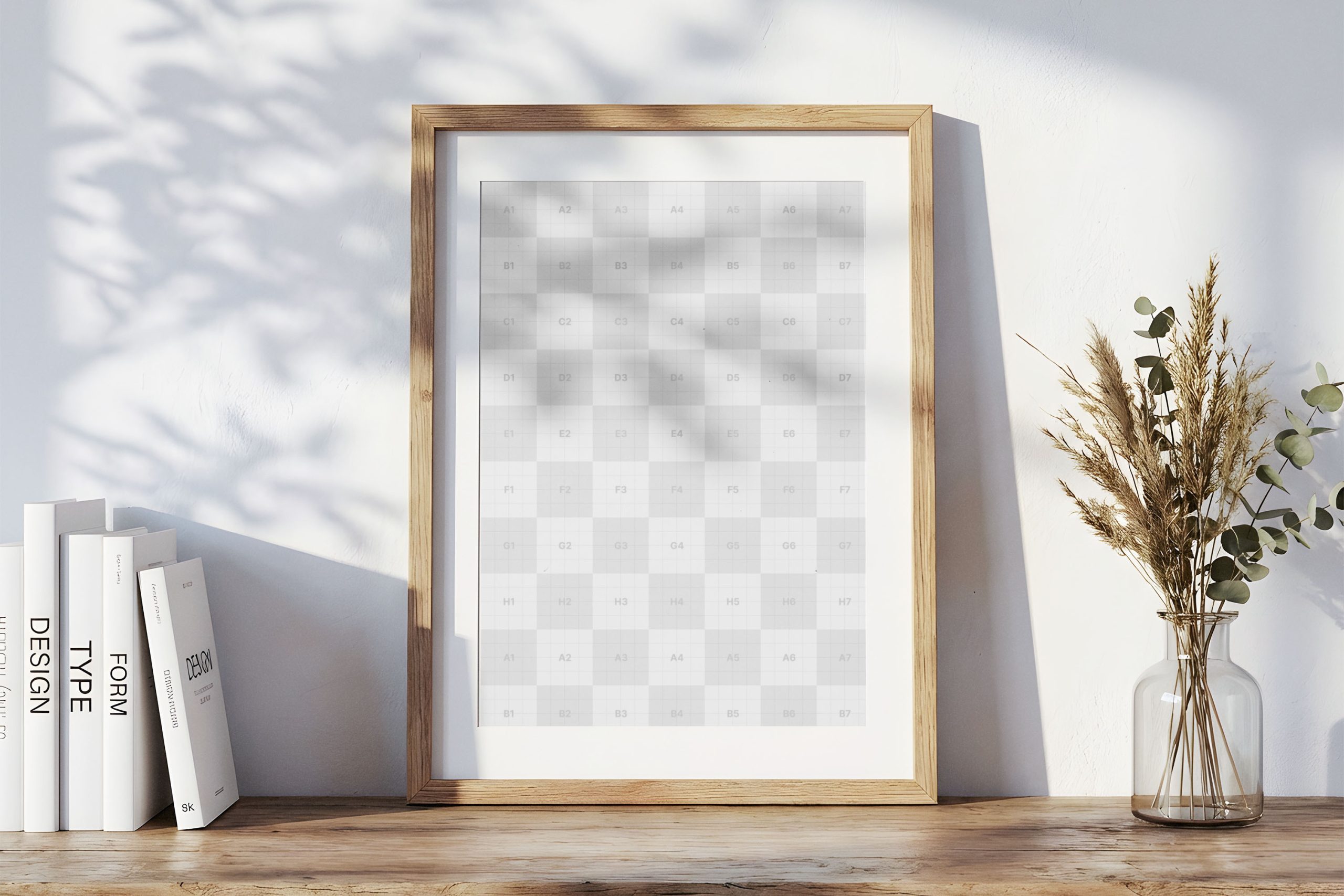 This elegant wooden frame poster mockup offers a sophisticated way to present your vertical art prints, photography, or branding designs. Set in a minimalist interior, the frame leans against a clean white wall adorned with soft, natural leaf shadows that add a touch of organic warmth. The scene features a rustic wooden shelf, complemented by a stack of design books and a delicate glass vase with dried botanicals, creating a professional lifestyle aesthetic. Designers and artists can use this high-quality template to showcase their portfolio work in a realistic, home-like environment. The balanced composition and neutral color palette ensure that your artwork remains the focal point while benefiting from the high-end atmospheric lighting. Perfect for social media, online portfolios, or marketing presentations, this mockup helps bridge the gap between digital design and real-world application.