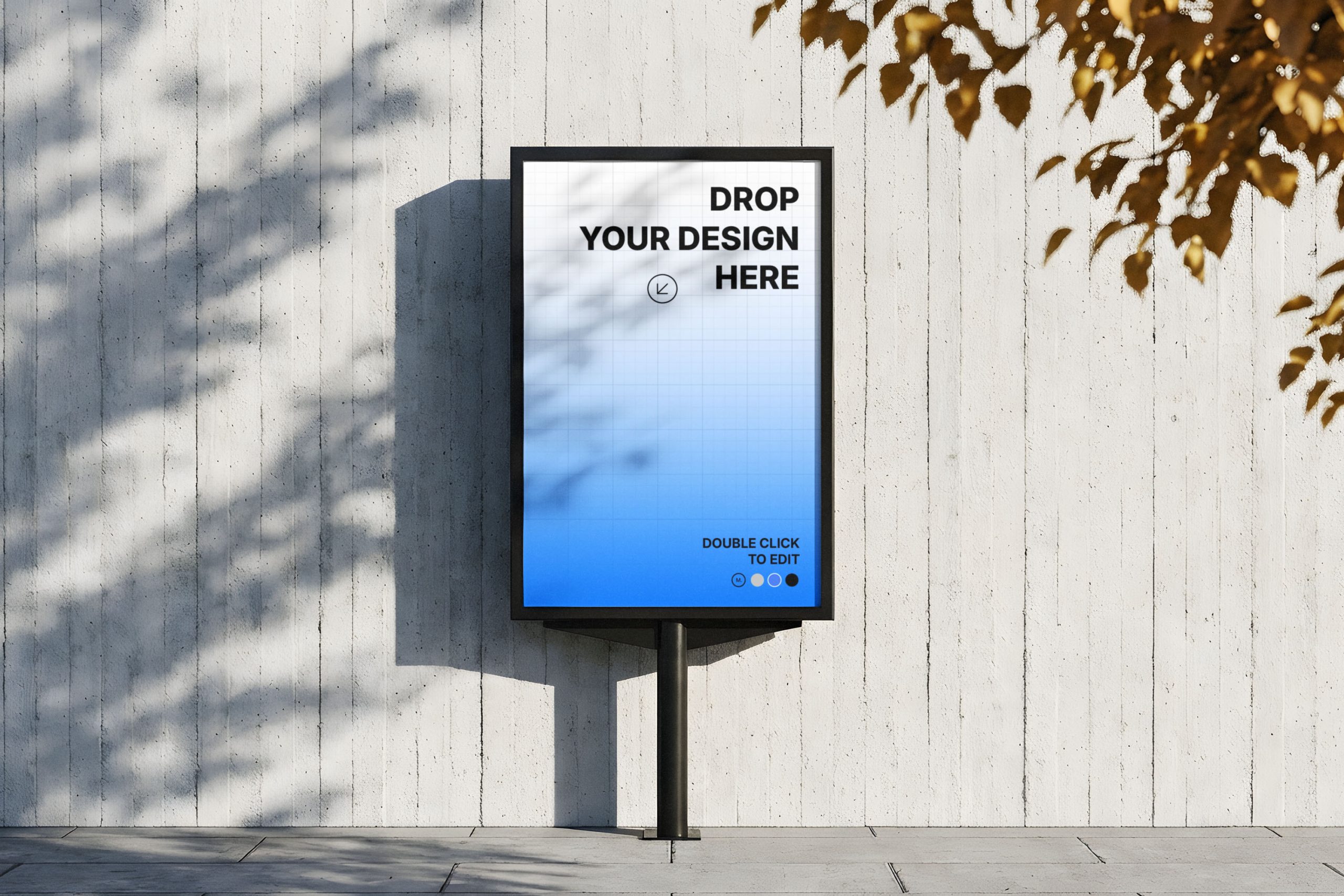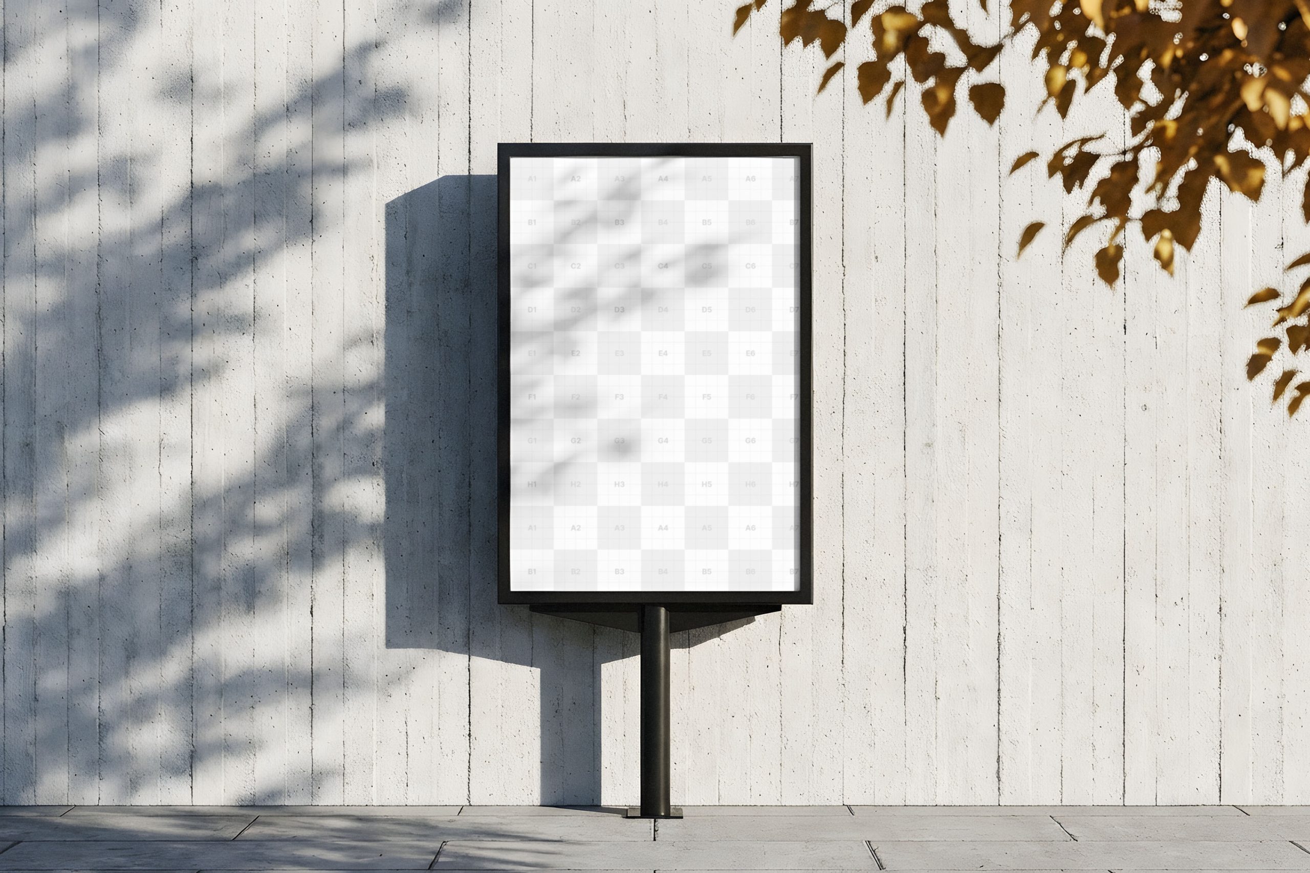 Showcase your creative advertising campaigns with this sophisticated outdoor vertical billboard mockup. This high-resolution asset features a sleek black frame mounted against a textured concrete wall, providing a modern and urban aesthetic for your brand presentations. The interplay of natural light and organic shadows from nearby foliage creates a realistic atmosphere that brings your posters and advertisements to life. Perfect for graphic designers, marketers, and brand agencies, this mockup allows you to visualize how your designs will look in a real-world city environment. Use it to present promotional posters, event announcements, or corporate branding with confidence. The clean composition ensures your artwork remains the focal point while maintaining a high level of photorealism. Simply drop your design into the smart object layer to achieve professional results in seconds, making it an essential tool for high-impact portfolio showcases or client presentations.
