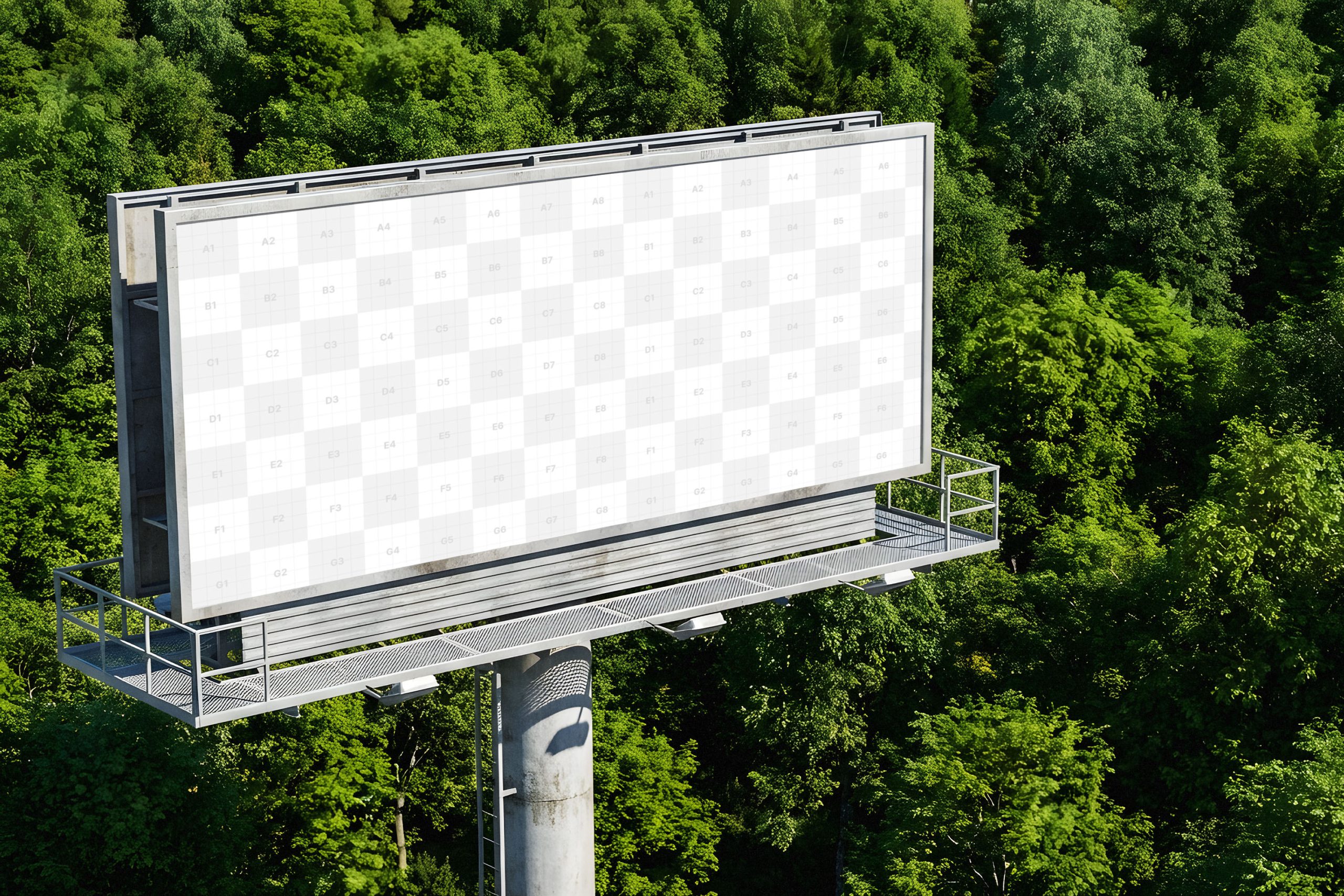 This premium outdoor billboard mockup features a massive advertising display set against a breathtaking backdrop of dense, vibrant forest trees. Ideal for showcasing large-scale branding projects, this high-resolution PSD template provides a realistic context for environmental, travel, or sustainability campaigns. The unique perspective from an elevated angle allows designers to demonstrate how their artwork interacts with natural lighting and organic textures. Whether you are presenting a new product launch or a public service announcement, this mockup ensures your vision stands out with professional clarity. With organized smart layers, you can easily swap in your custom designs and adjust the visual balance. This asset is perfect for portfolios, client presentations, and marketing pitches that require a touch of the outdoors. Elevate your advertising strategy by placing your creative work in this stunning, high-impact landscape setting.