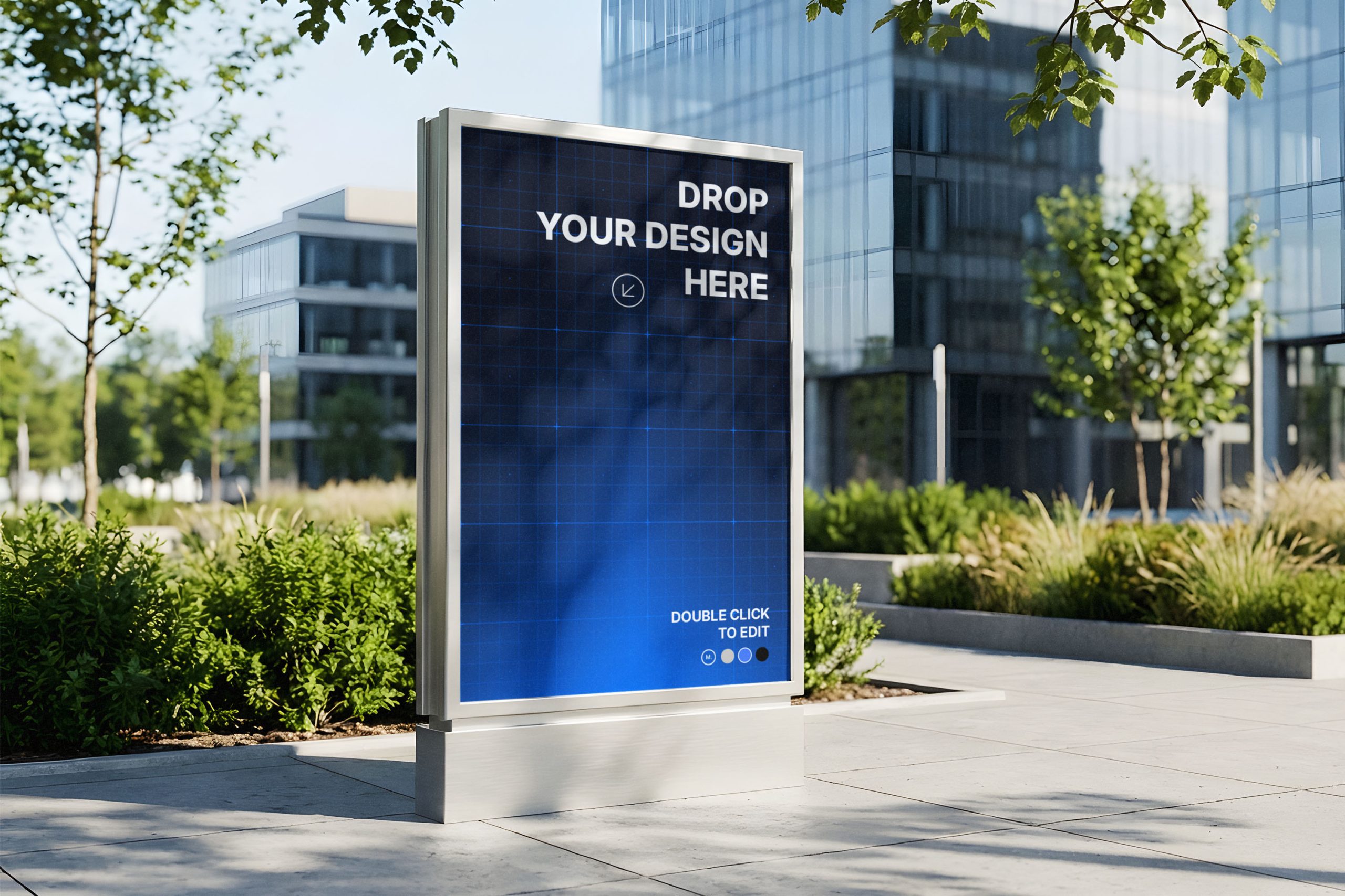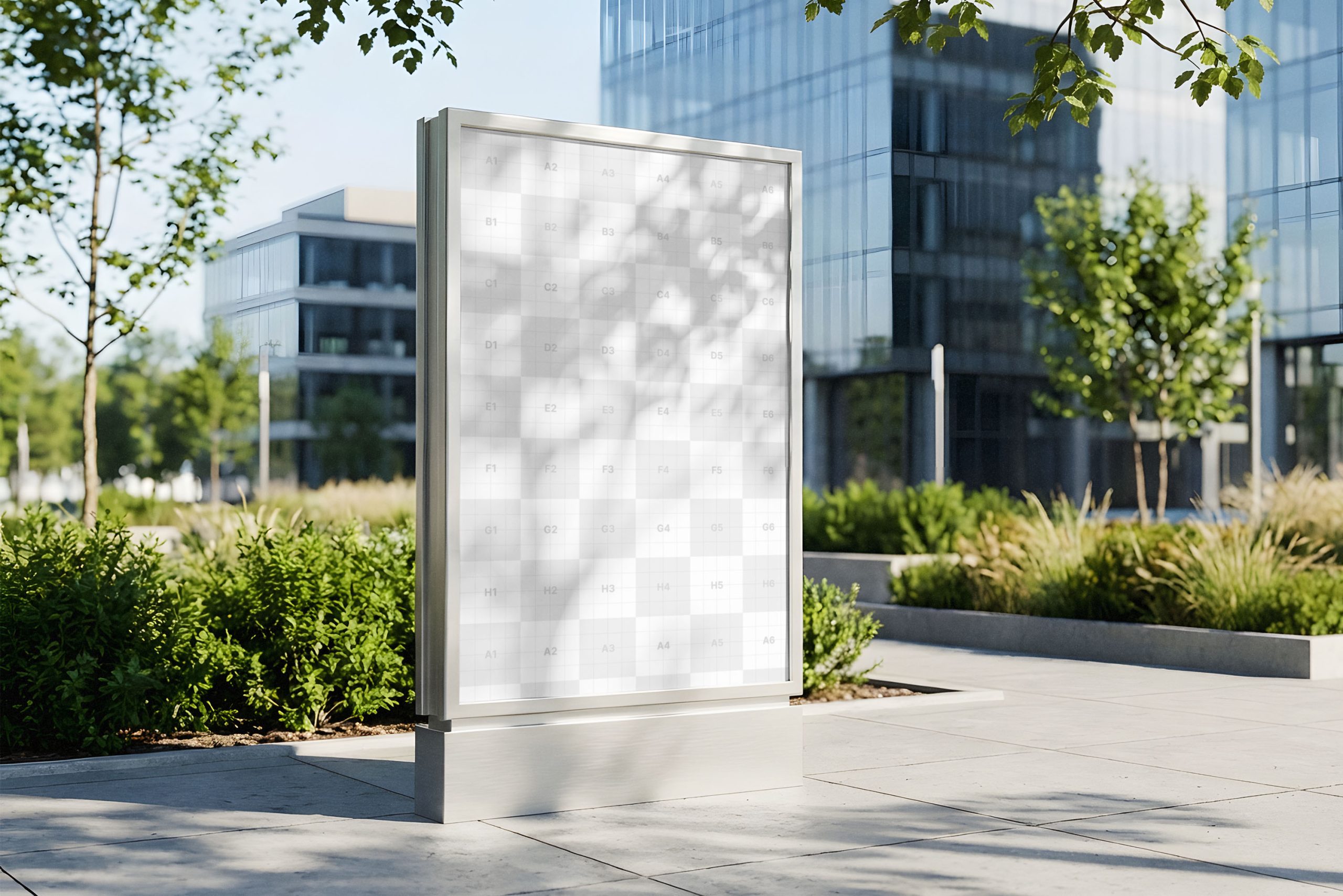 Elevate your outdoor advertising presentations with this premium Outdoor Lightbox Mockup, designed to give your creative work a realistic edge. Featuring a vertical, sleek metal frame set against a backdrop of modern glass architecture and lush urban greenery, this mockup provides an authentic context for brand identity and marketing campaigns. Whether you are showcasing a new product launch, a cinema poster, or a corporate announcement, the clean lighting and high-resolution details ensure your designs stand out with professional clarity. This versatile asset is ideal for graphic designers looking to impress clients with high-fidelity visuals that mimic real-world lighting and reflections. The vertical orientation is perfect for mupi-style displays often found in transit hubs and city centers. Simply place your artwork into the smart layer to achieve a polished result in seconds, saving you time while maintaining the highest aesthetic standards for your portfolio or pitch deck.