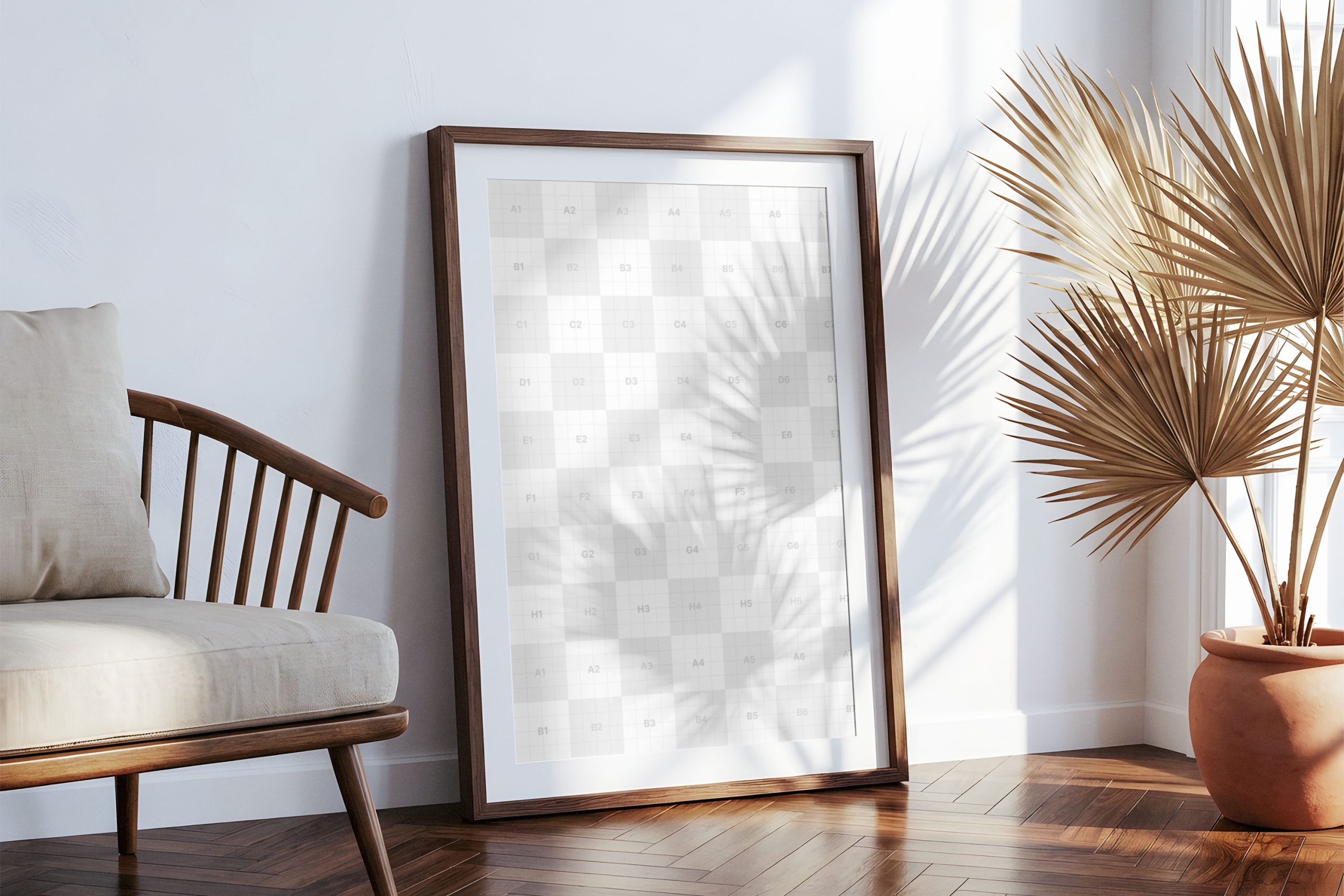 Elevate your digital portfolio with this stunning vertical poster frame mockup, designed to showcase your artwork in a realistic, modern interior setting. This high-resolution asset features a large wooden frame leaning against a clean white wall, beautifully lit by soft, natural sunlight and intricate palm shadows. It serves as an ideal solution for graphic designers, illustrators, and photographers who need to present their posters, fine art prints, or brand messaging in a professional lifestyle context. The sophisticated composition, including a minimalist wooden chair and a terracotta-potted plant, creates an inviting atmosphere that highlights your design’s best features. Using the included smart object functionality, you can seamlessly integrate your graphics and achieve a high-end look in seconds. This mockup is a versatile choice for portfolio displays, social media marketing, or client presentations, ensuring your creative work makes a lasting impression.