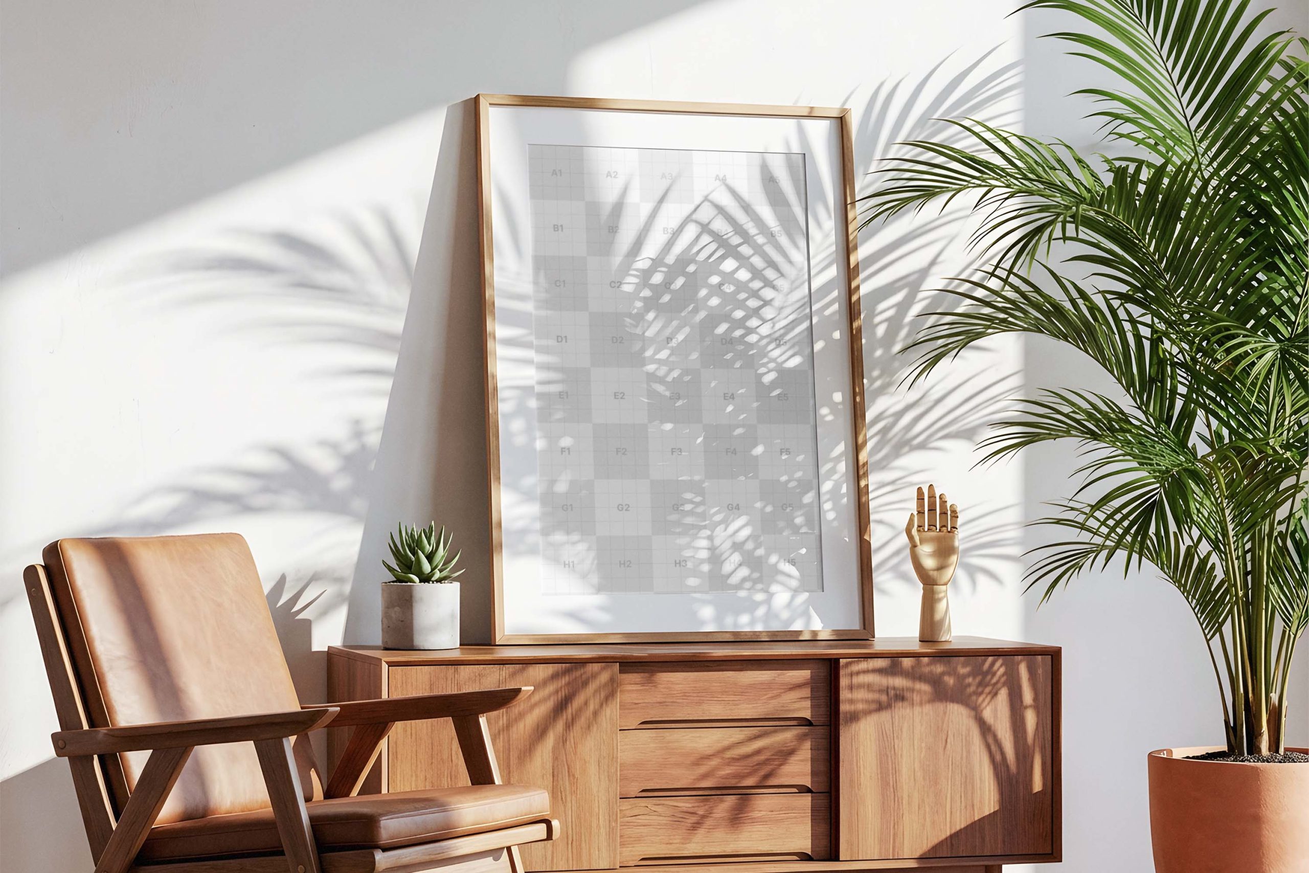 Enhance your creative presentations with this realistic vertical poster frame mockup set in a warm, mid-century modern interior. This high-quality graphic allows designers and artists to showcase their latest work against a sophisticated backdrop featuring a wooden sideboard, a leather armchair, and natural indoor plants. The organic play of palm leaf shadows across the frame adds a layer of depth and authenticity that is hard to replicate, making your designs feel truly tangible. Ideal for portfolio displays, social media marketing, or client presentations, this mockup provides a professional aesthetic that highlights the fine details of your art or branding. Whether you are featuring a minimalist typography piece or a vibrant illustration, the neutral tones and natural lighting ensure your work remains the focal point while benefitting from a stylish, real-world context.