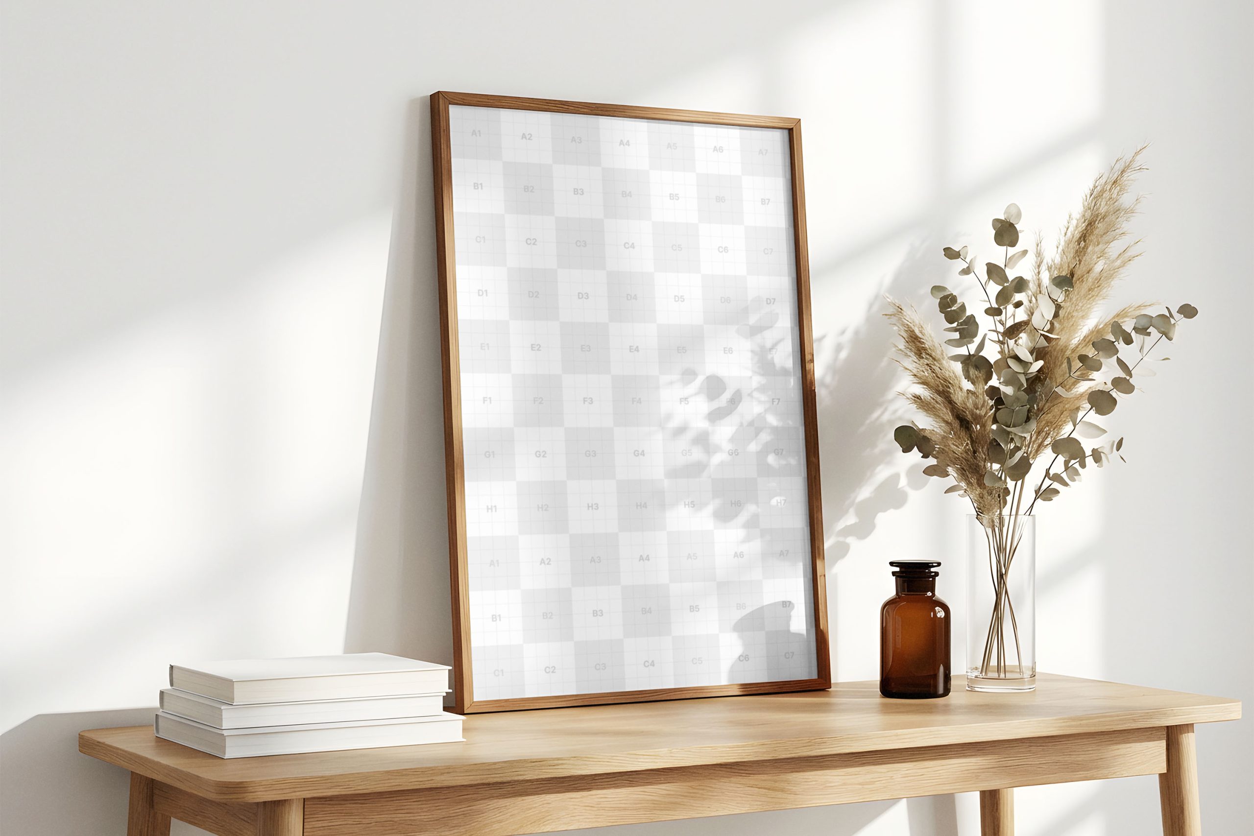 This professional vertical poster frame mockup offers a serene and minimalist setting for showcasing your artwork or branding designs. Set against a clean white wall on a natural wooden table, the scene is enhanced by soft sunlight and botanical shadows, creating a sophisticated lifestyle atmosphere. This asset is ideal for graphic designers, illustrators, and photographers looking to present their work in a realistic interior context. The high-resolution file ensures every detail of your design is captured with clarity. With its smart object layer, you can effortlessly swap out the placeholder for your custom graphics, making it a perfect tool for portfolio updates, social media posts, or client presentations. The warm wooden texture of the frame and the decorative elements like pampas grass add a touch of elegance that makes your creative projects stand out in a competitive market.
